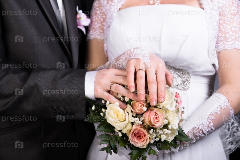 Руки молодоженов на букете
