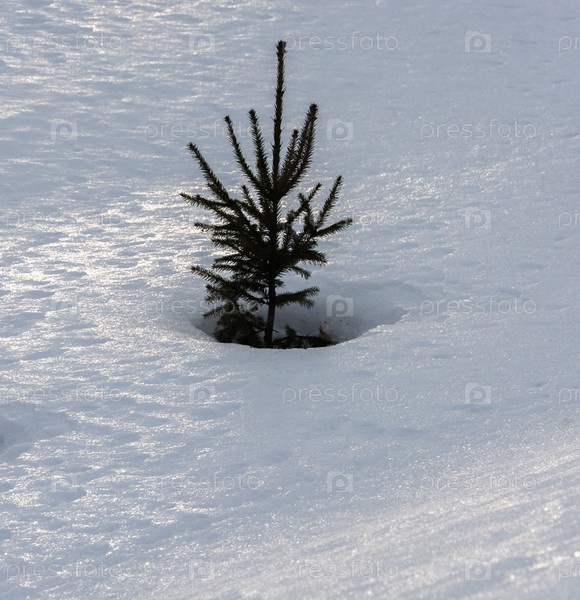 Небольшая ель растет из снега