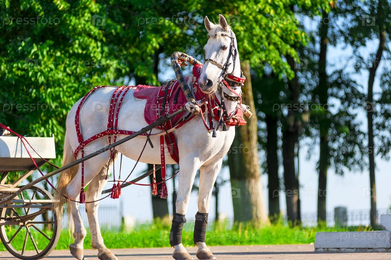 Запряженная белая лошадь стоит на солнечной улице