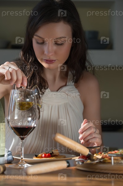 Женщина ест домашнюю пиццу и пьет вино