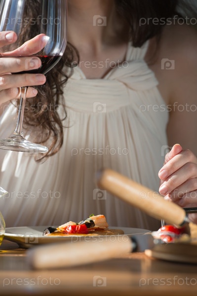 Женщина ест домашнюю пиццу и пьет вино