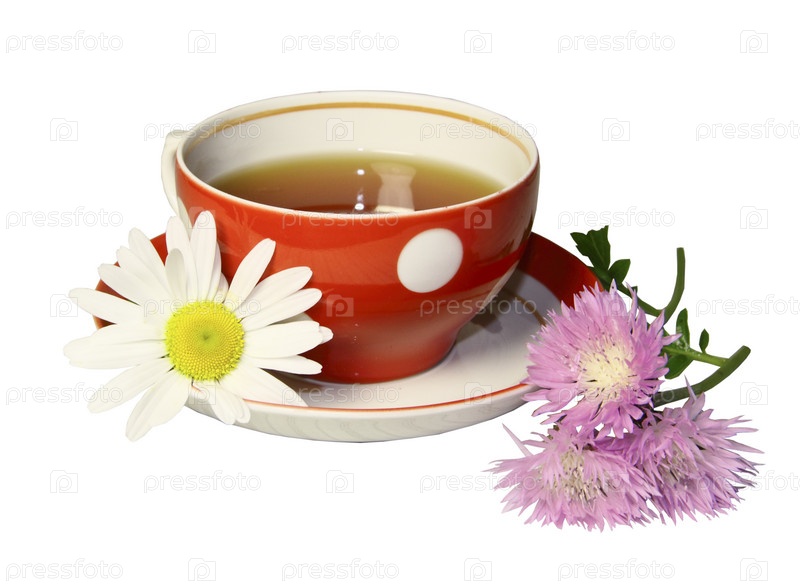 Чашка чая и цветы на белом фоне