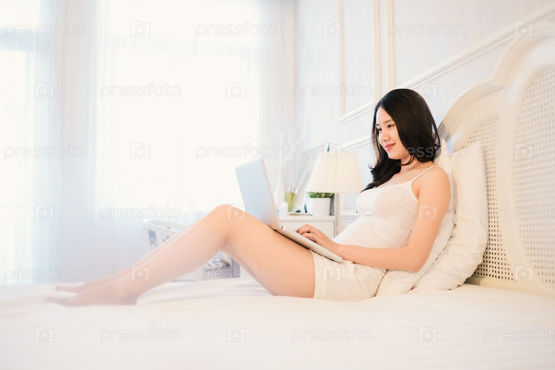 Женщина работает на ноутбуке в кровати