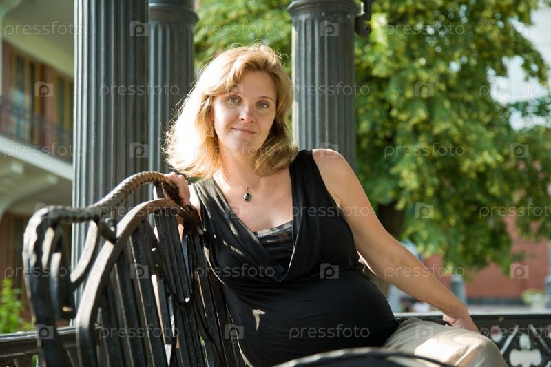 Беременная женщина в парке на скамейке
