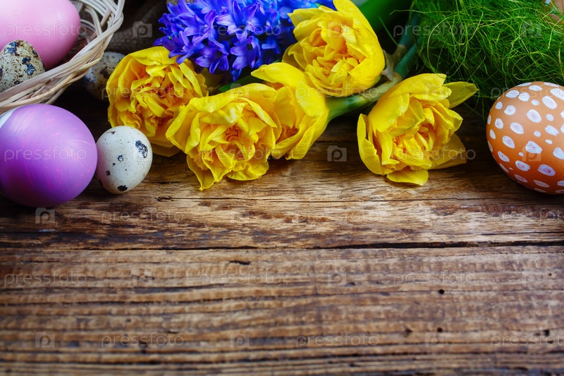 Пасхальные украшения на деревянном фоне