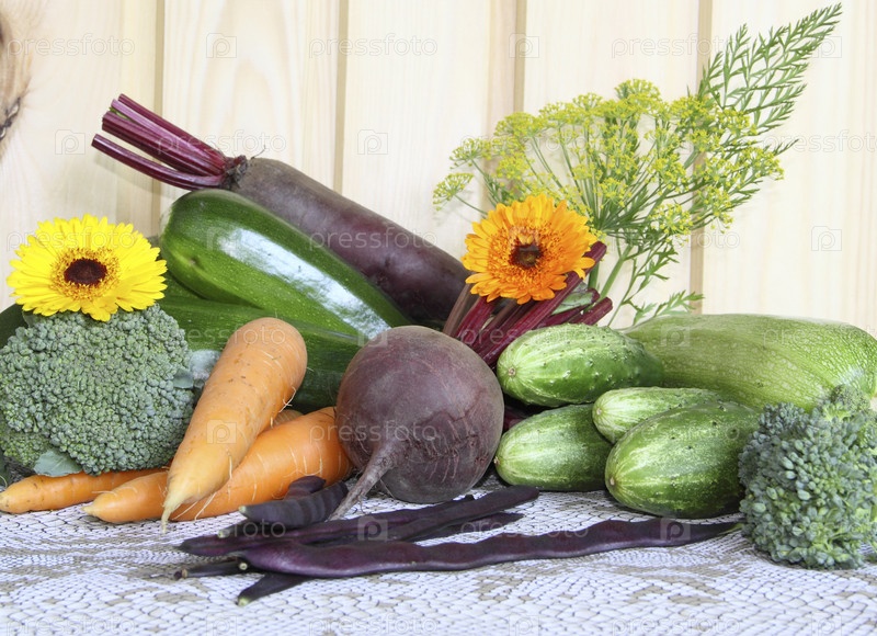 Натюрморт из свежих садовых овощей и цветов
