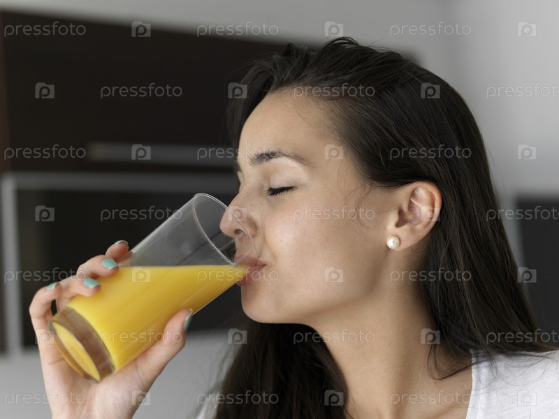 Женщина пьет сок в кухне
