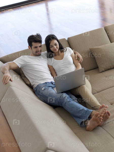 Молодая пара работает на ноутбуке дома