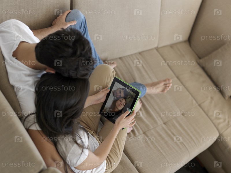Молодая пара фотографируется дома