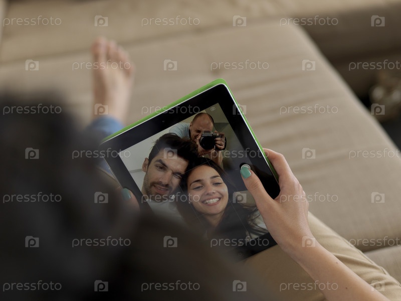 Молодая пара фотографируется дома