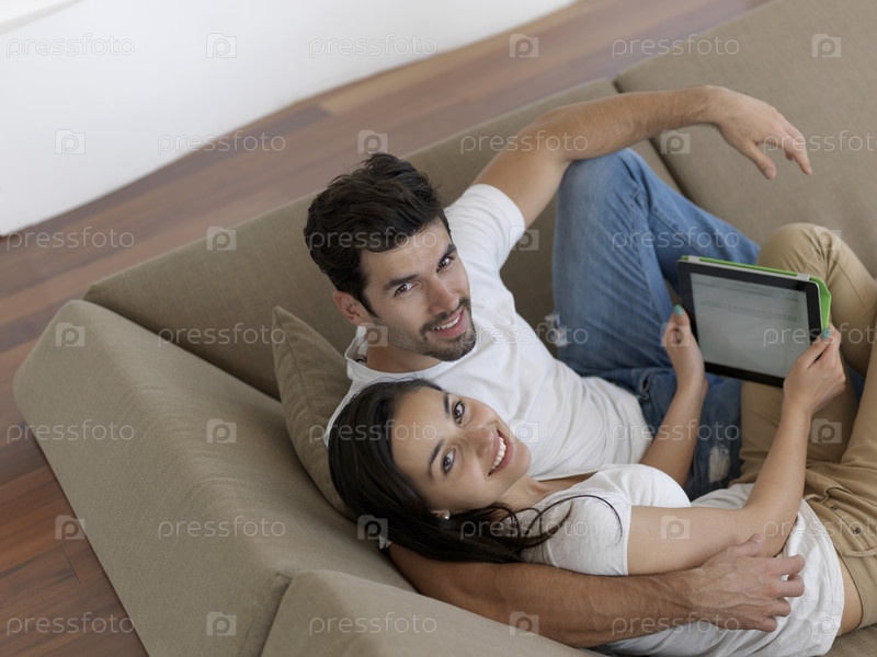 Молодая пара фотографируется дома