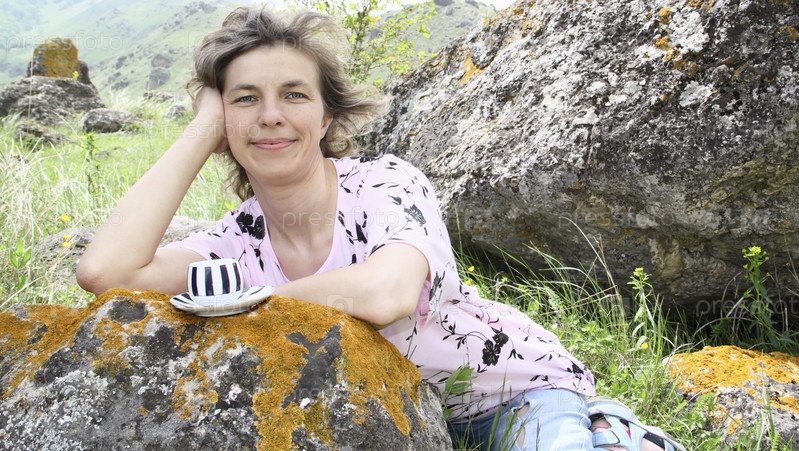 Портрет молодой женщины, сидящей с чашкой возле камня
