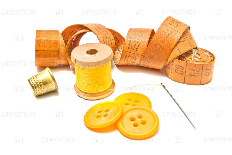 Измерительная лента, пуговицы и катушка с желтой нитью