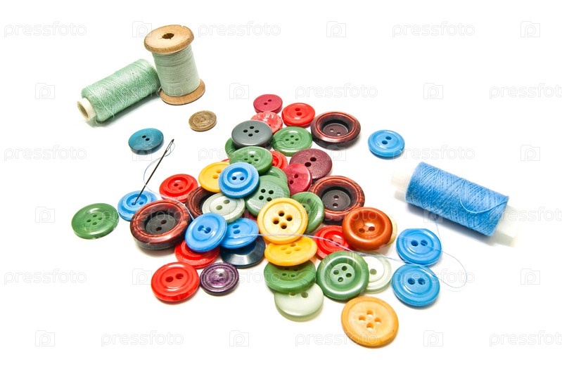 Катушка голубой нити и пуговицы на белом фоне