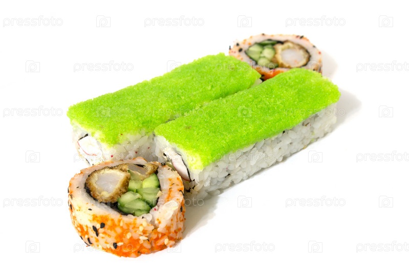 Круглые роллы с огурцом и крабом на белом фоне