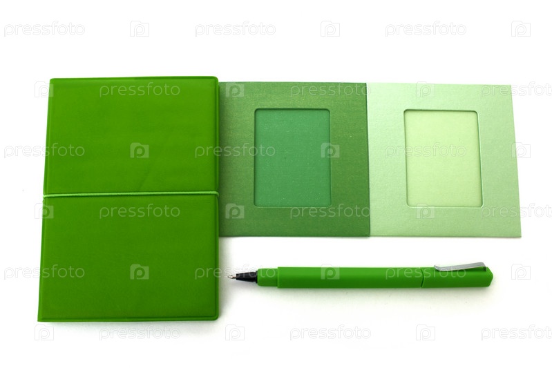 Зеленый блокнот и ручка, изолированные на белом
