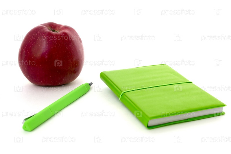 Зеленый блокнот и яблоко, изолированные на белом