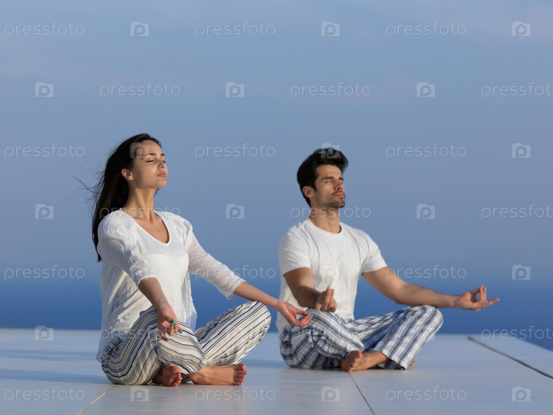 Молодая пара занимается йогой