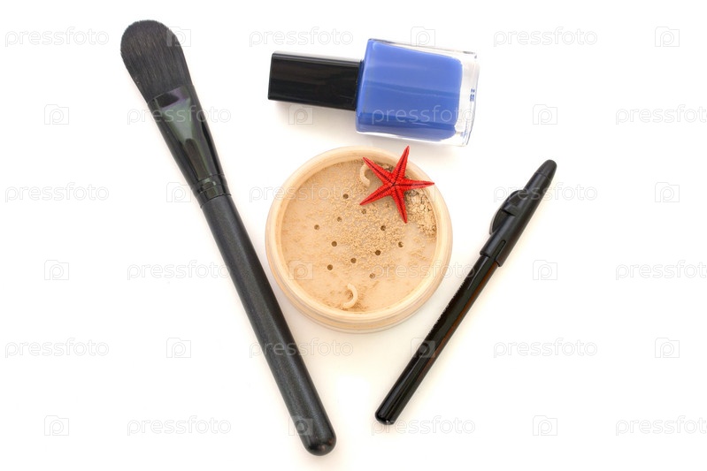 Пудра, кисти и лак, изолированные на белом