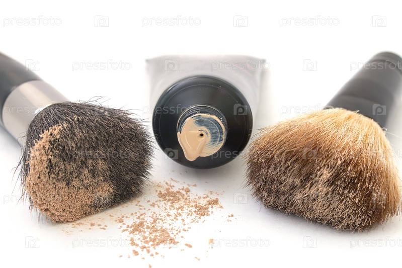 Кисти и тональный крем, изолированные на белом