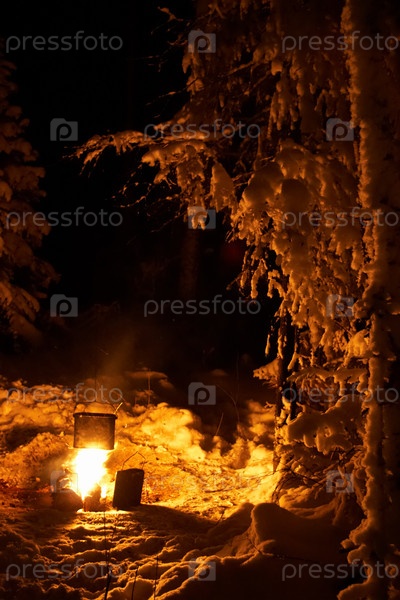 Приготовление пищи на костре во время зимней лыжной поездки, Южный Урал, Россия