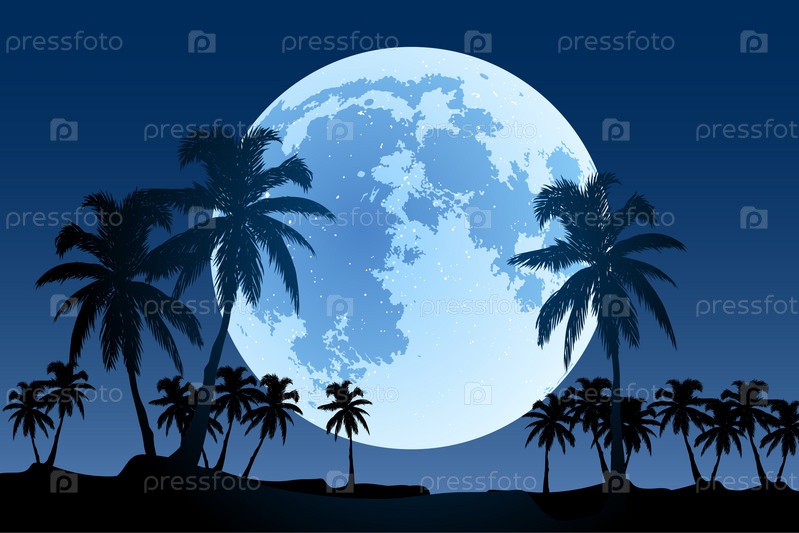 Силуэты пальм на фоне полной луны, иллюстрация