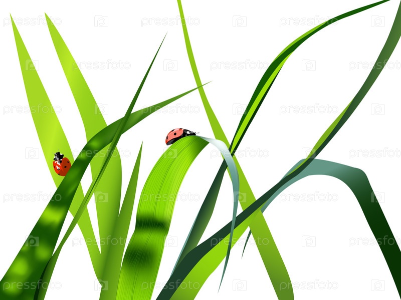 Зеленая трава и божьи коровки, иллюстрация на белом фоне