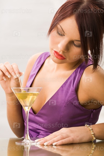 Портрет задумчивой красивой девушки, сидящей за столом с мартини на ней
