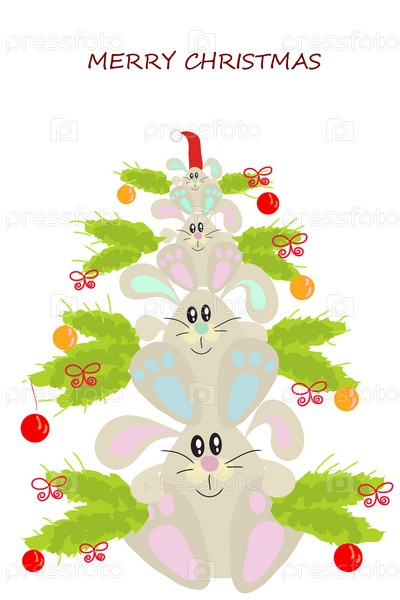 Новогодняя елка из кроликов, иллюстрация на белом фоне