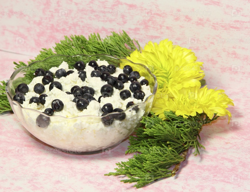 Творог, черника, астры и зеленые ветки