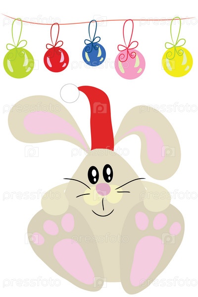 Заяц в новогоднем колпаке рядом с елочными шарами