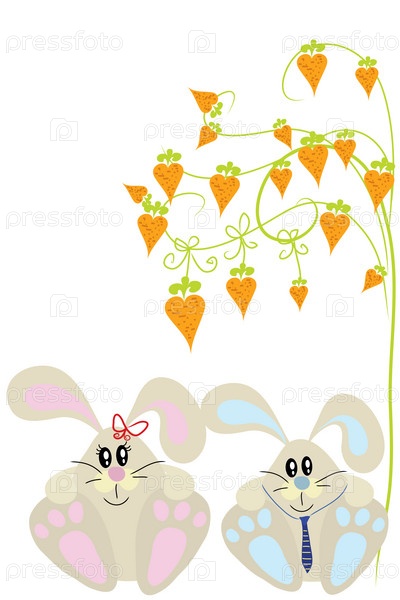 Два забавных милых зайчика под морковным деревом