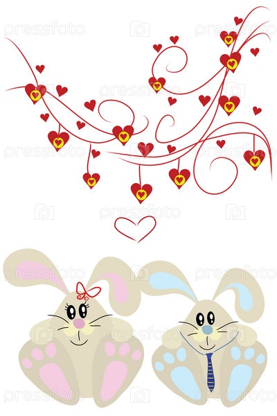 Серые смешные влюбленные милые зайчики под деревом с сердечками
