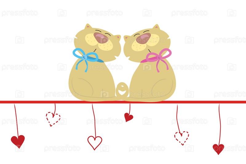 Влюбленные кот и кошка на линии с сердечками