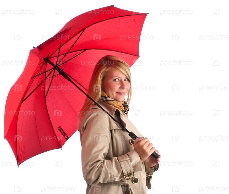 Красивая блондинка с красным зонтиком, изолированный на белом
