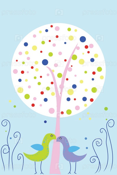 Две влюбленные птицы у дерева