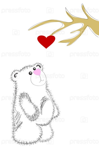 Медведь стоит рядом с красным сердцем на ветке дерева