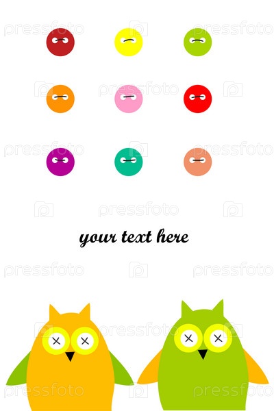 Две совы и пуговицы на белом фоне, с местом для текста, векторная графика