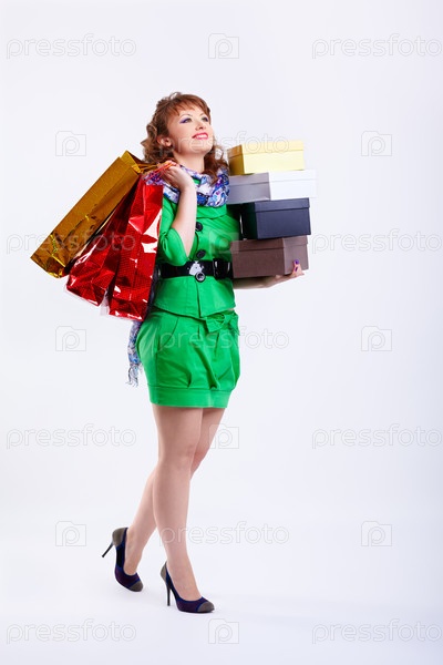 Молодая женщина с покупками в зеленом платье на сером фоне