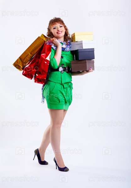 Молодая женщина с покупками в зеленом платье на сером фоне