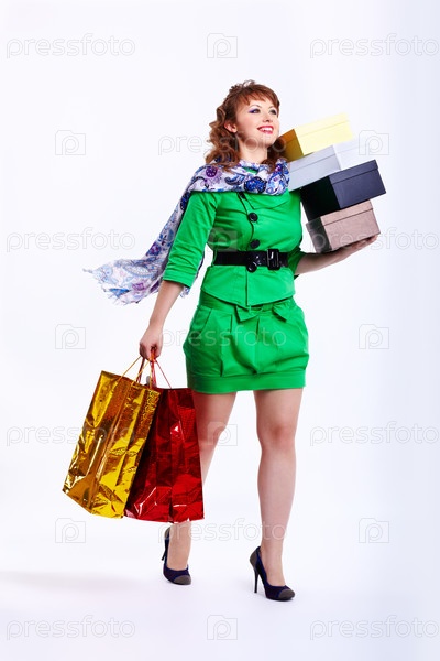 Молодая женщина с покупками в зеленом платье на сером фоне