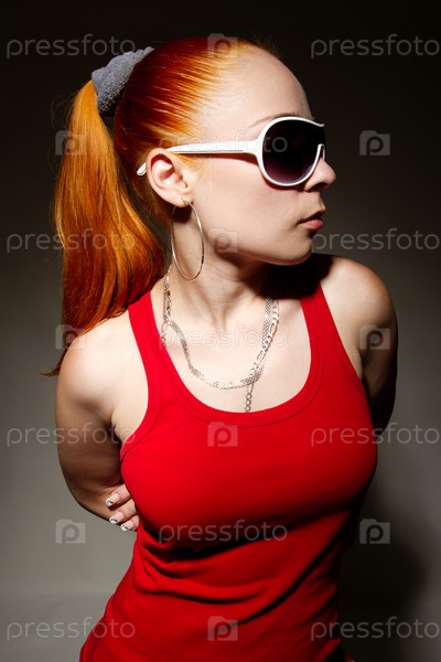 Рыжеволосая девушка в солнечных очках на темном фоне