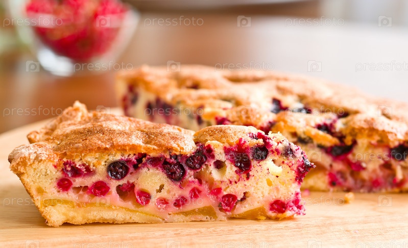 Кусок пирога и ягоды красной смородины на деревянной доске