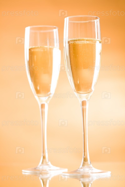 Изображение двух флейт, полных газированного шампанского на оранжевом фоне