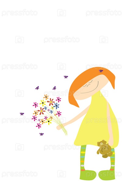 Смешная девочка с букетом цветов на белом фоне