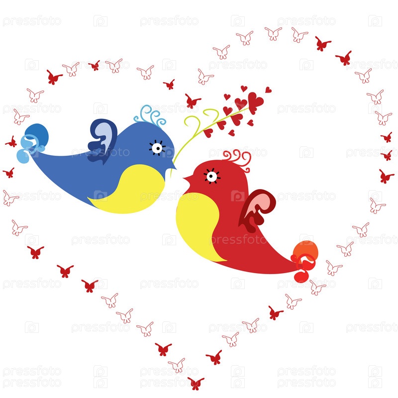 Красивая пара влюбленных птиц в красном сердце