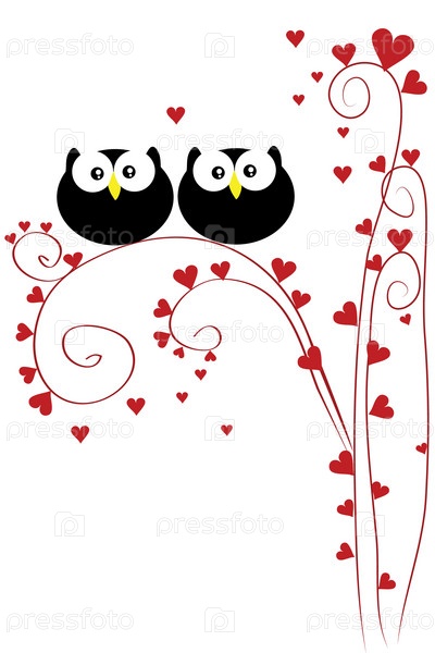 Смешные влюбленные совы сидят на дереве из сердечек