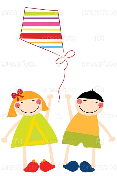 Девочка и мальчик с воздушным змеем, иллюстрация на белом фоне