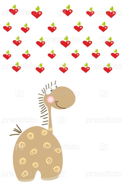 Забавная лошадка и яблоки-сердечки, иллюстрация на белом фоне
