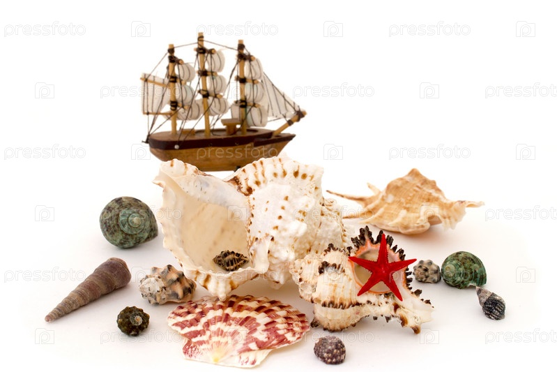 Раковины и игрушечный корабль, изолированные на белом